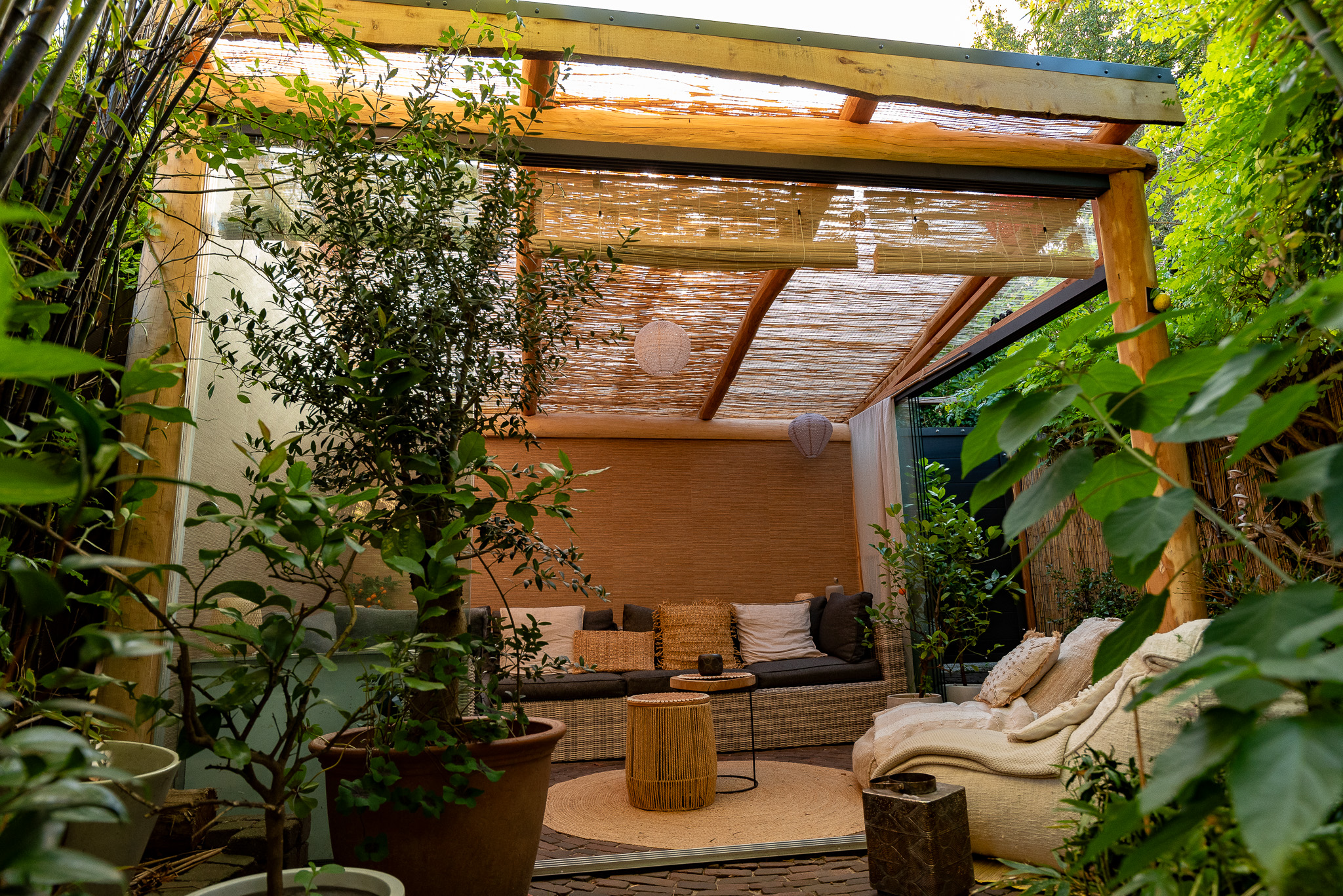 Over de hele breedte van de tuin is een buitenverblijf gemaakt in de vorm van een grote driehoek. De diepste ruimte is gereserveerd voor de woonkamer. Vanuit de woonkamer kom je in de ruime slaapkamer, vervolgens in de badkamer en tot slot in de wasruimte.