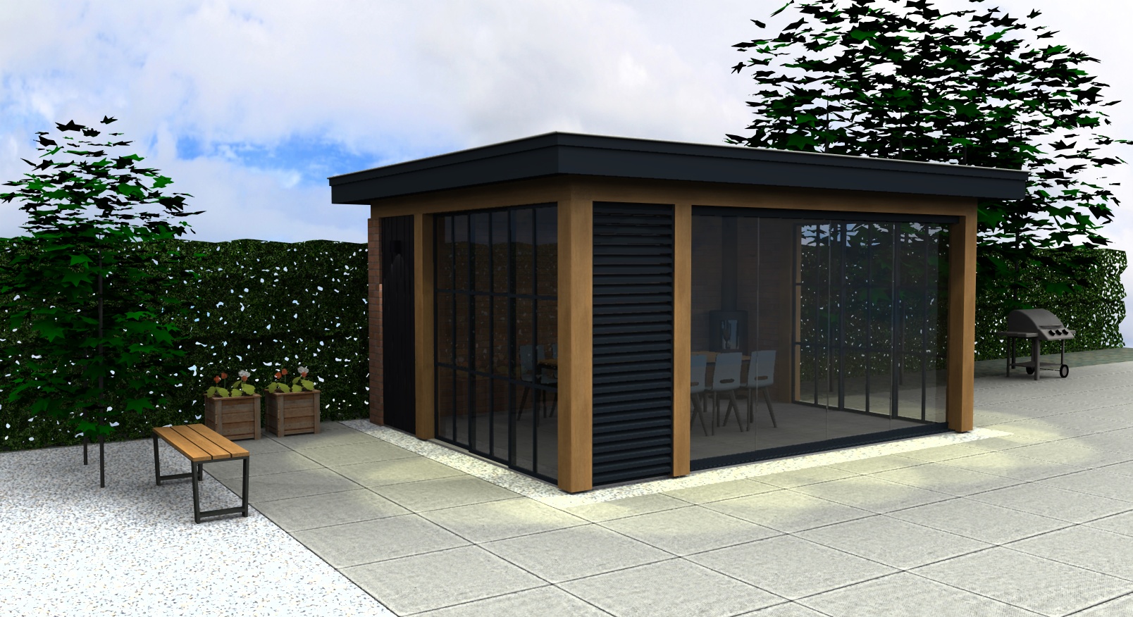 De prachtige eikenhouten balken combineren heel mooi met de strakke, zwarte boeirand, de sfeervolle lamellen en de bakstenen muur. De verschillende schuifdeuren maken het geheel tot een sfeervolle tuinkamer.