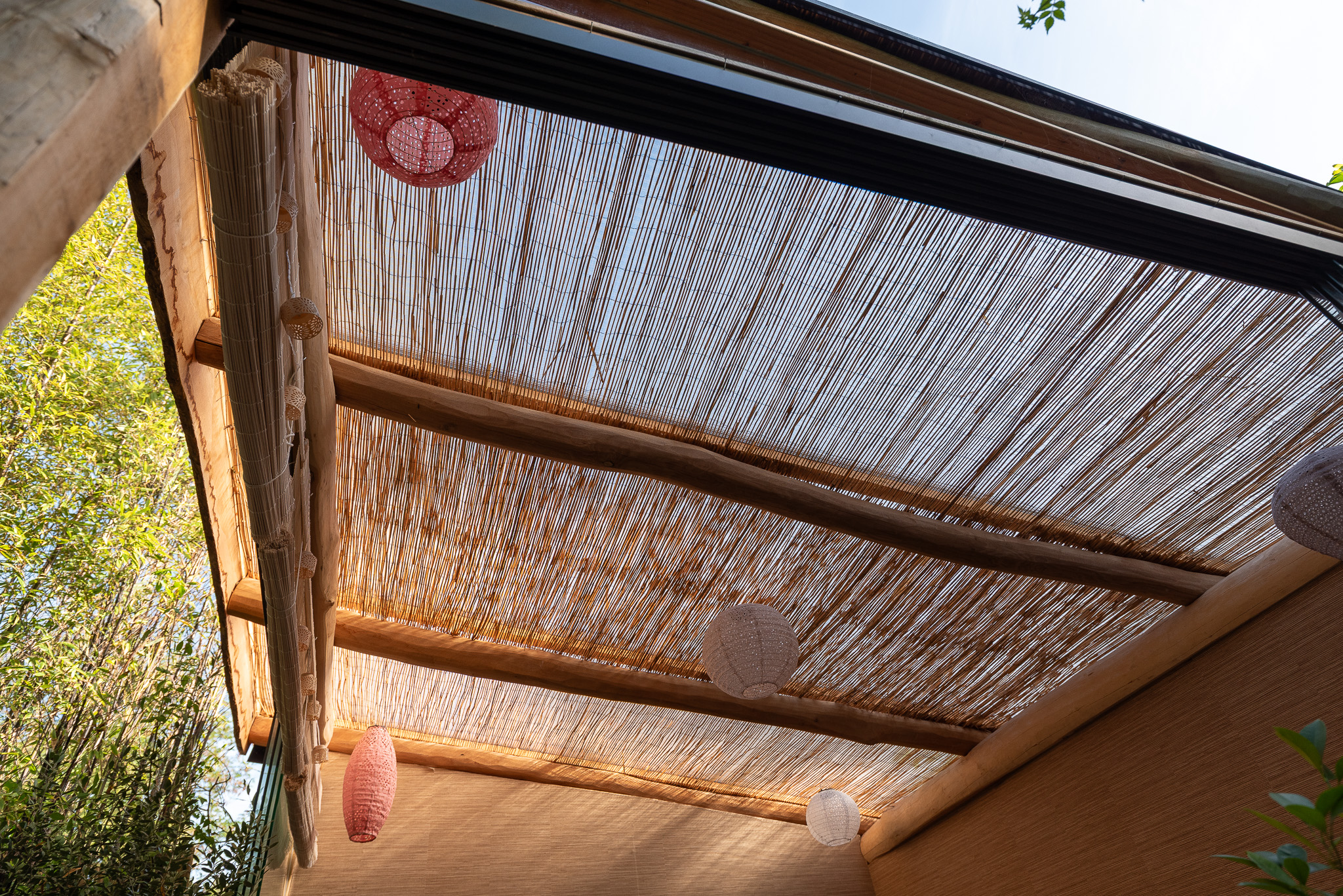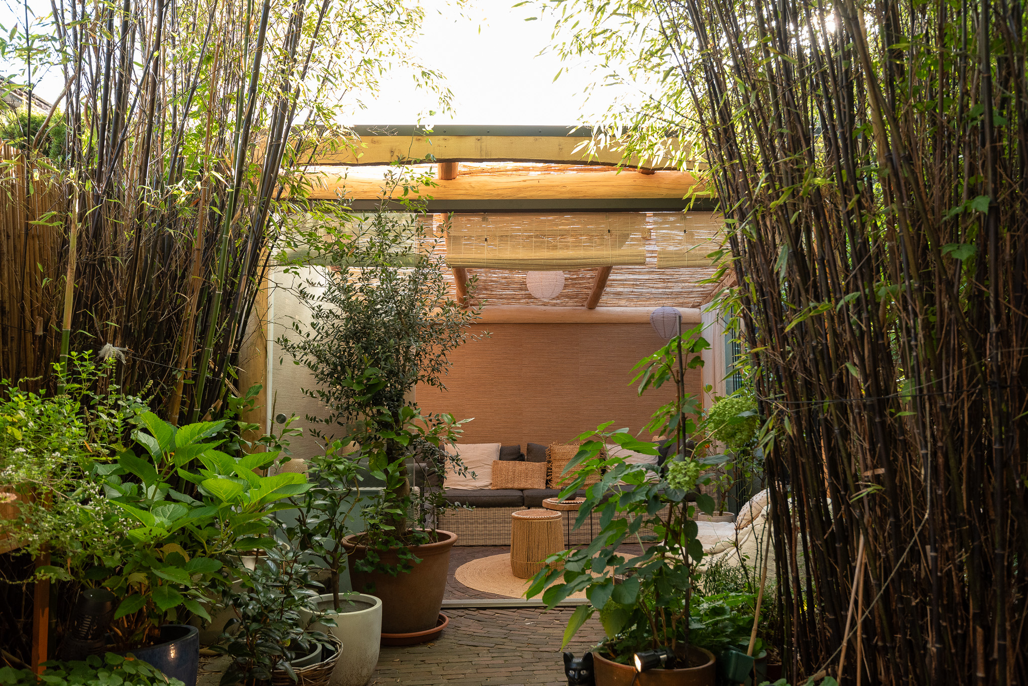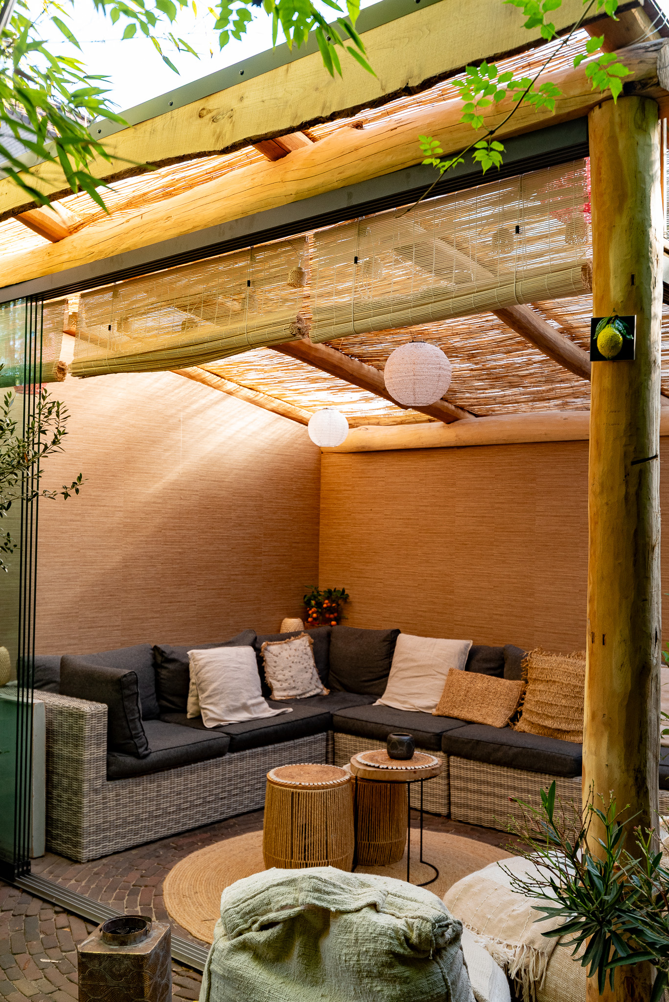 Met deze overkapping in Ibiza stijl waan je je op vakantie in eigen tuin… Hier zijn natuurlijke elementen gecombineerd met praktische elementen, om het zo aangenaam mogelijk te maken onder de overkapping.