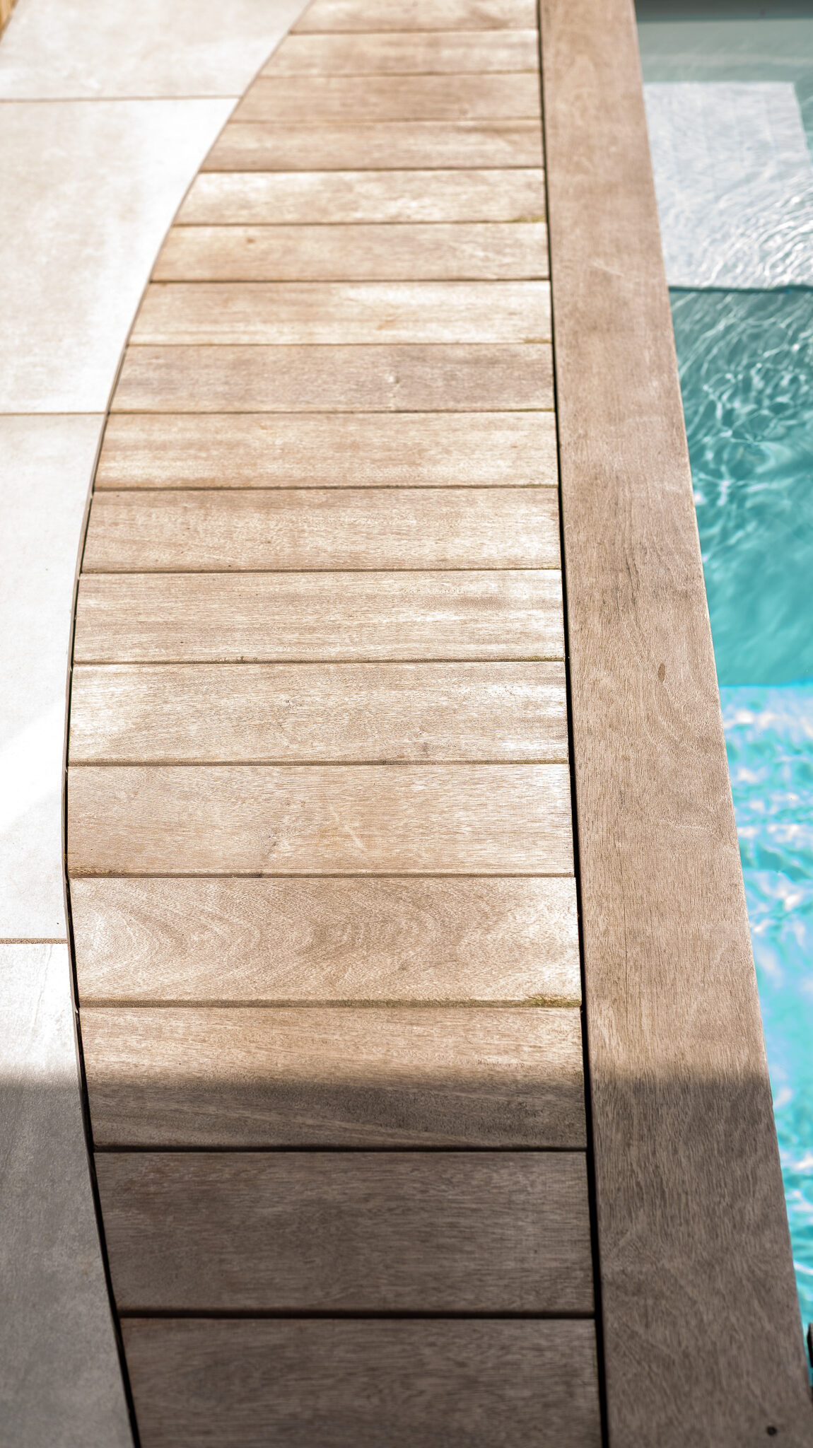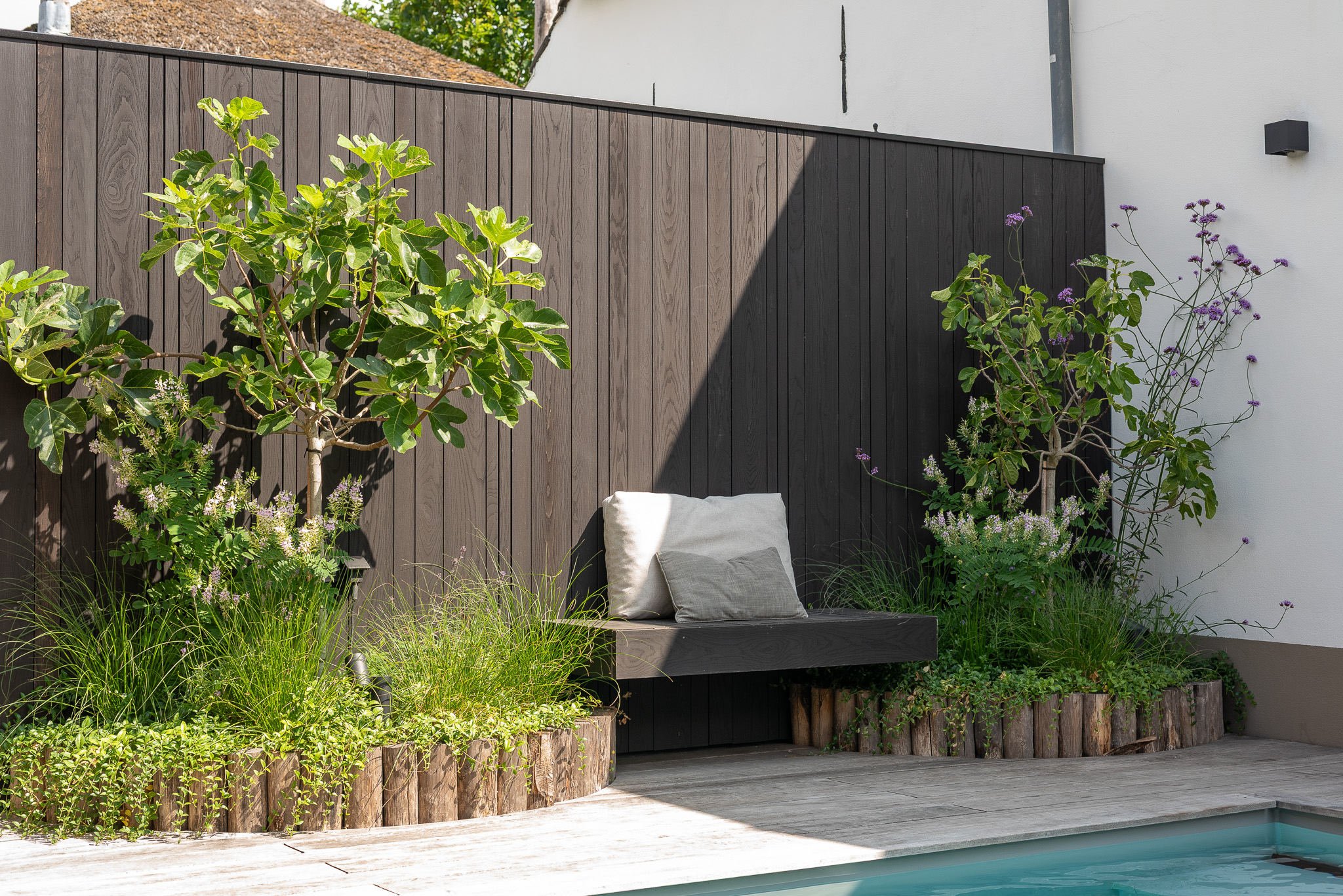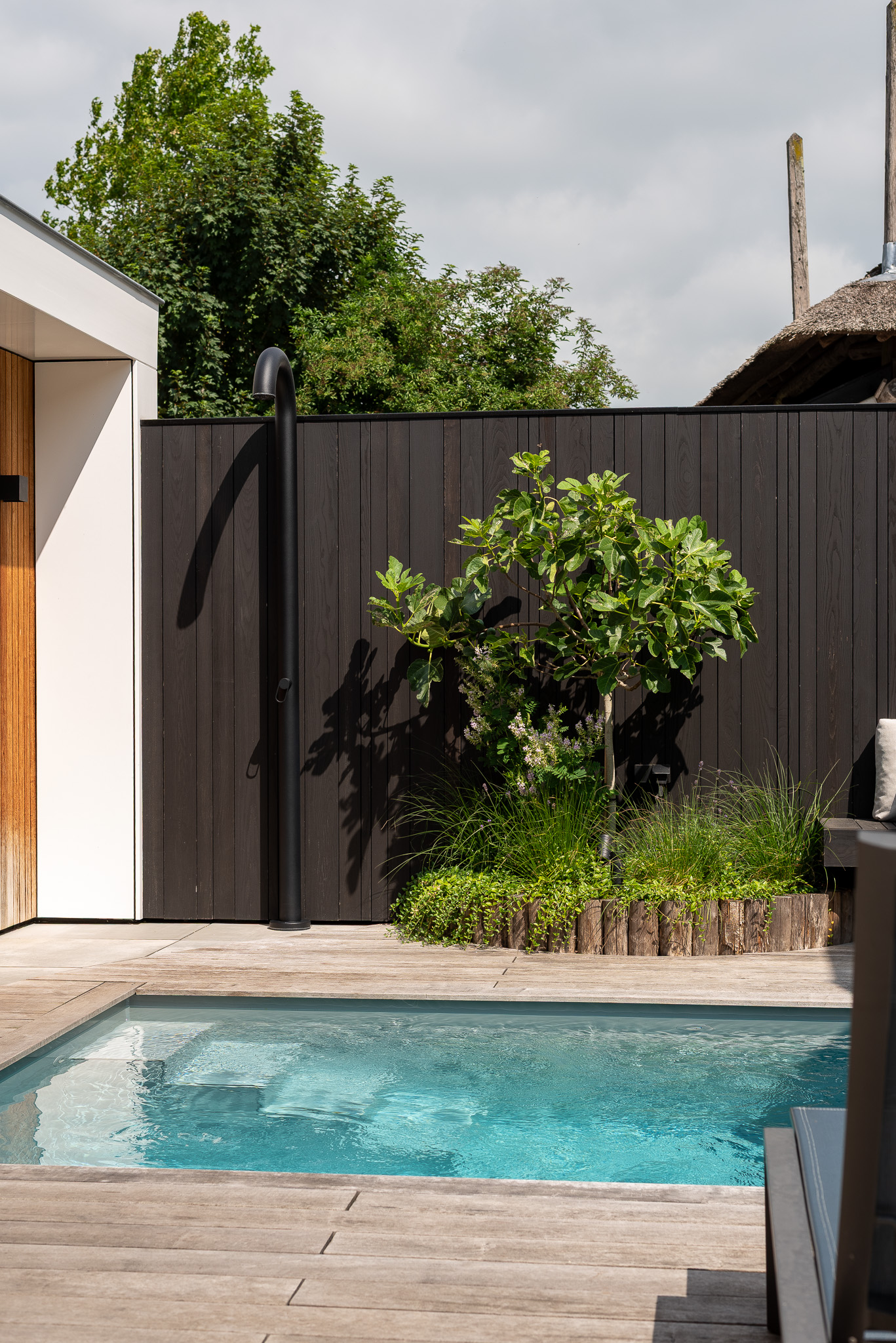 De houten vlonder is in een cirkel gelegd, waardoor dit een speels effect creëert aan de vloer en de lijnen jouw aandacht verleggen naar het zwembad. De ronde vormen komen in meerdere elementen in de tuin terug, waaronder de plantenbakken.