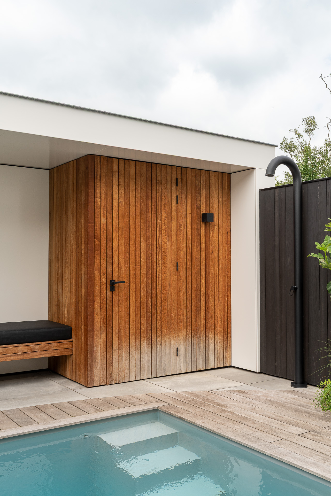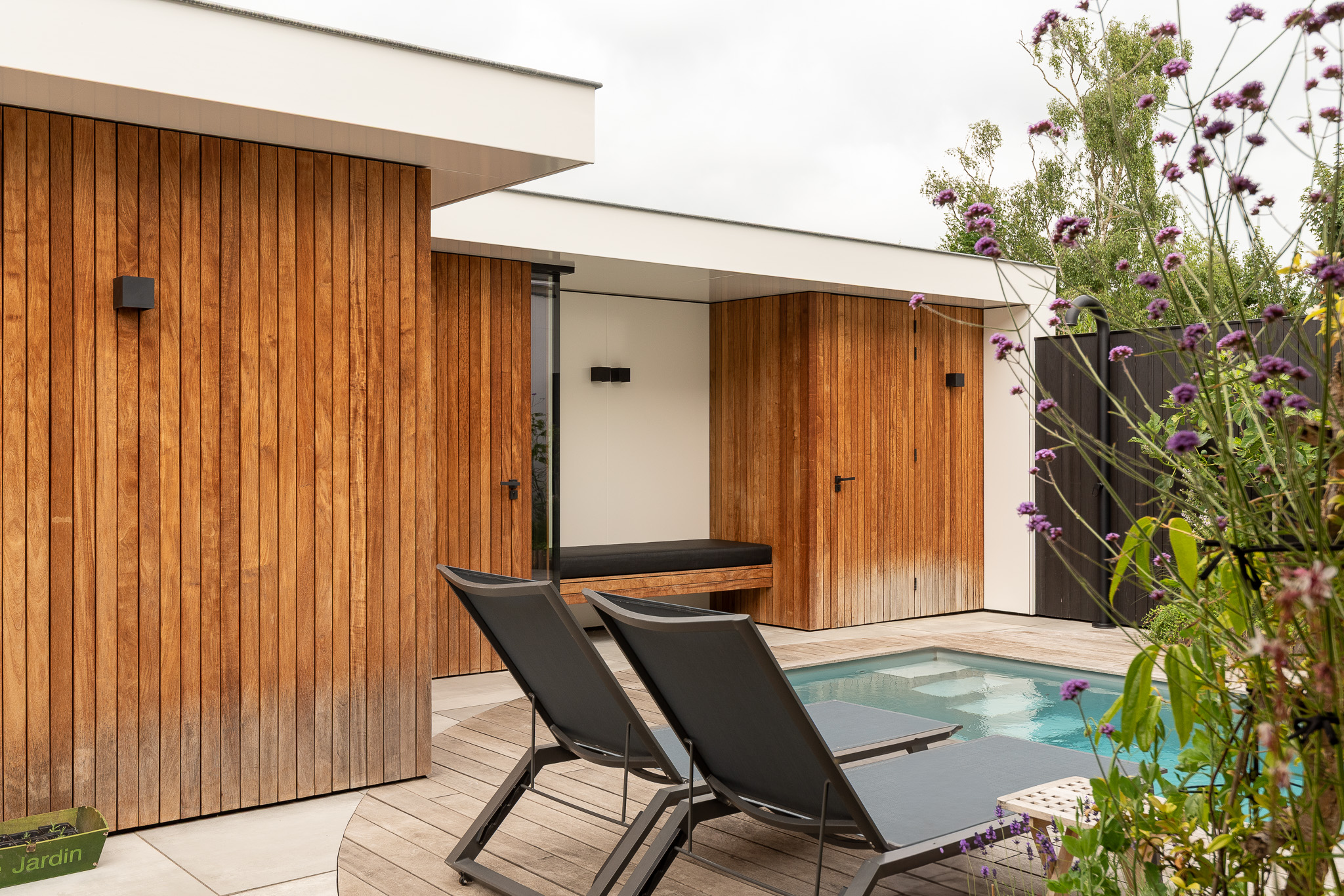 In het buitenverblijf met gesloten ruimtes is plaats gemaakt voor een technische ruimte voor de plungepool, een sauna met uitzicht op de mooie tuin en een ruime berging.