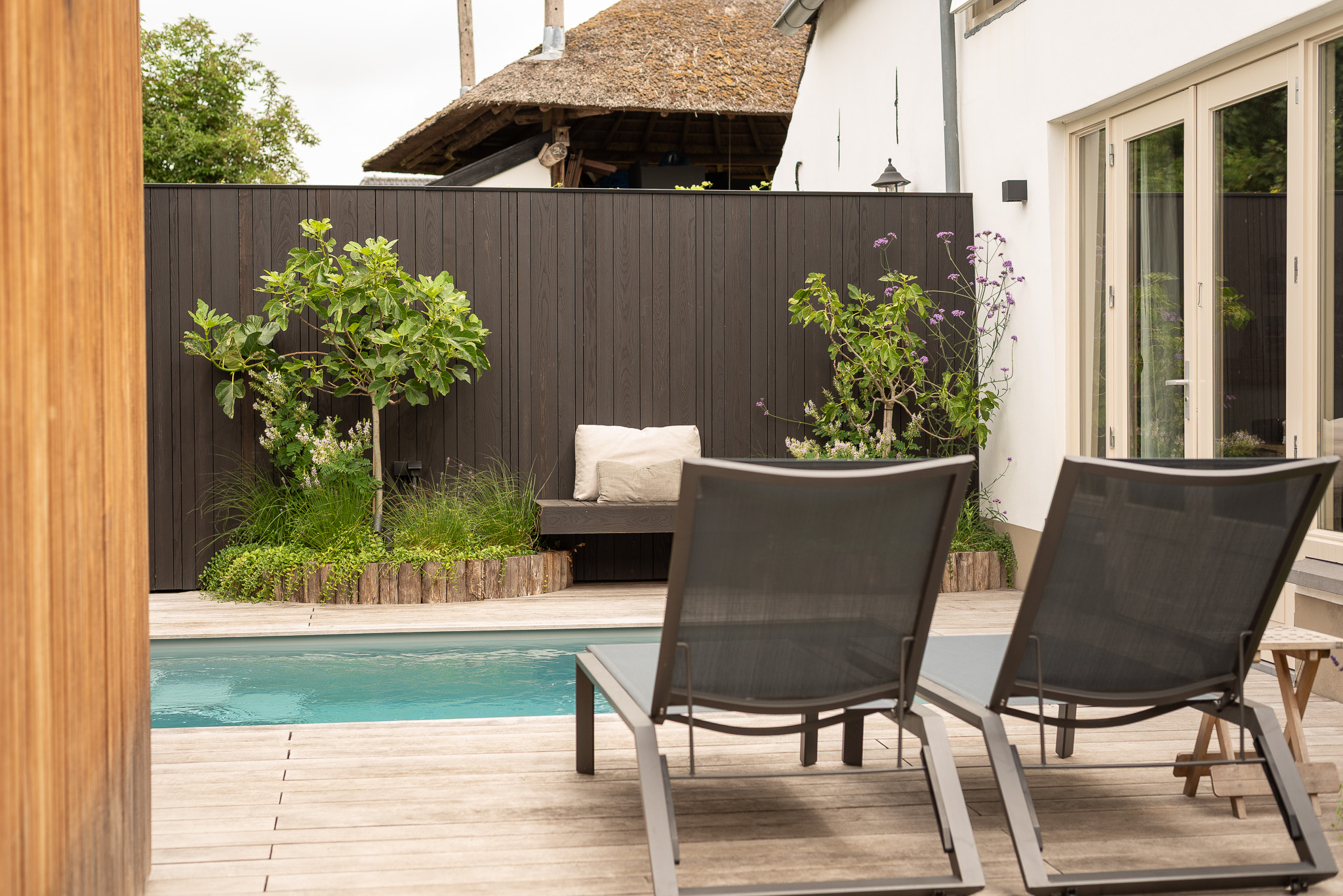 Deze tuin heeft een L-vorm en is opgesplitst in 3 gedeeltes: de mooie entree met ruime overkapping om gezellig samen te zijn, een open zitgedeelte en de plunge pool met omliggende zitjes. Door de vele zitplaatsen kun je altijd een fijn plekje vinden om te genieten.